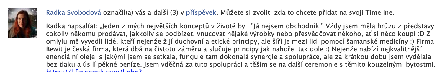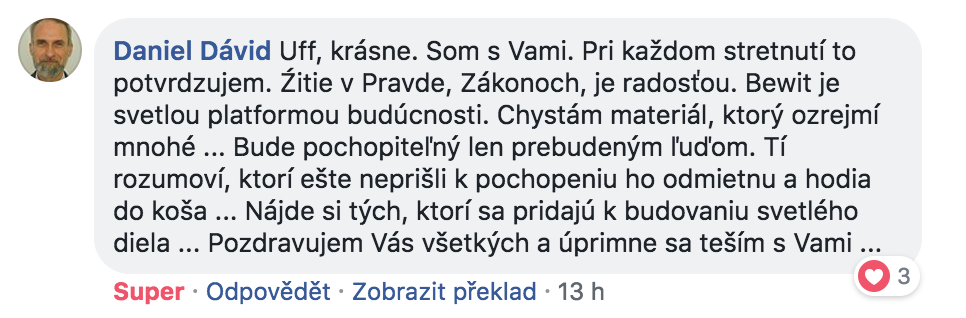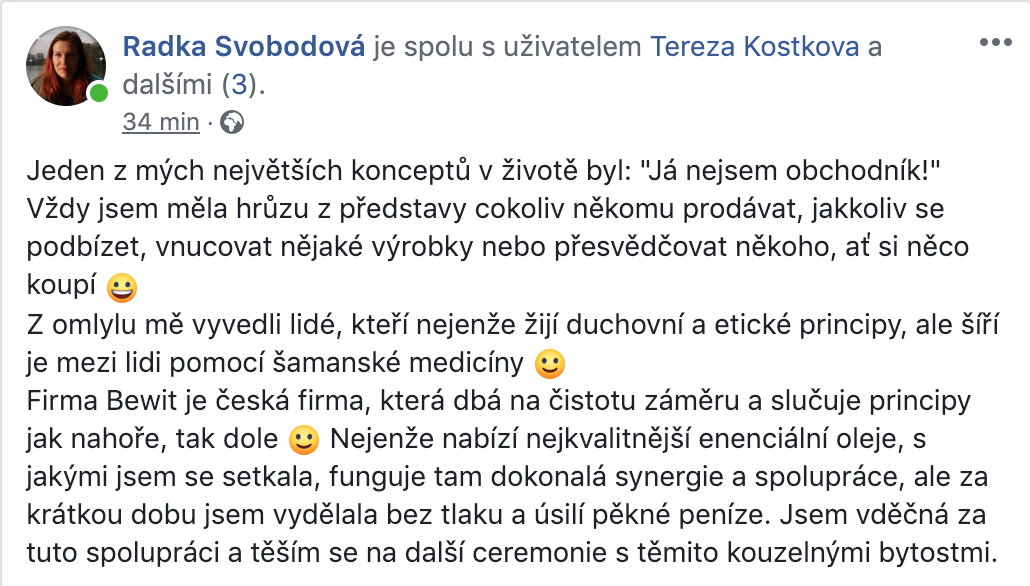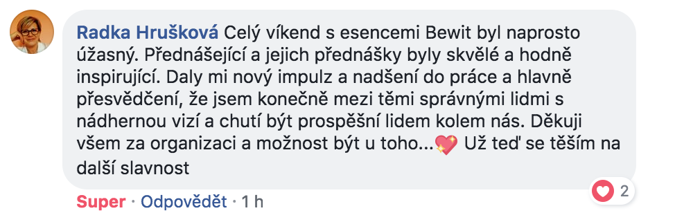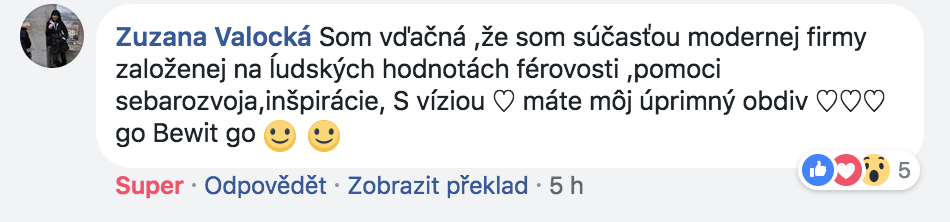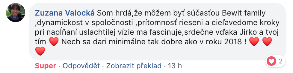 Největší sílu a energii do systému přinesla jednoduchá myšlenka, kterou jsem měl na začátku. Chtěl jsem, ať je BEWIT hodně úspěšnou firmou. Dával jsem si znova a znova otázku, jak to udělat, a nakonec jsem nalezl odpověď: BEWIT bude úspěšný, když budou úspěšní lidé, kteří s ním spolupracují. Možná to zní banálně, nebo až příliš jednoduše, ale tak to někdy v životě bývá. Co je jednoduché, to je dokonalé. Nyní vidím, že BEWIT má potenciál transformovat společnost. Jsem nadšený, že mohu být součástí takového procesu. Přeji všem, ať dělají, to, co je baví a to, co jim dává smysl. Ať jsou všichni šťastni.